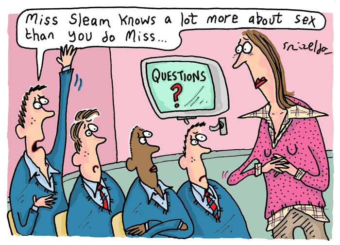 Article | Published in The TES on 4 May 2007 | By: Catherine Paver, writing as Emily Shark. Cartoon by Grizelda Why is there so much cover these days? Where is everyone? "Day-trip to Roman Villa at Fishbourne. Staff absent: R Spatley, M Sleam, S Glape, J Salvatore..." Bloody hell! How did I miss that? And how did La Sleam fix a whole day drifting around sexy Roman mosaics with the gorgeous Jon Salvatore? "Miss, we've seen this." I can't read this box. Is that 25 minutes or 35? It's a fairly crucial difference in a classroom, guys... Yuck. I thought they'd give us the how-they-met stuff first. Now, in my mind's eye, I see Sleam and sexy Jon sprawled across a Roman mosaic. Go away! Eurgh...Look, where's the rest of the family? Wouldn't there be an annoying little sister scratching at the bedroom door? Or a spaniel? "Millie and Jack know everything about each other..." Then what will they talk about when they're 40? And that cartoon inset box does not make this look like a funky magazine programme. It just looks like a pervy cartoon. It's funny. No one teaches you how to sleep with someone. How to remove your arm from under a snoring man's head. How to make sure you don't wake up with earplugs in your hair. What not to say if the sex goes wrong. "Sex is all about communication..." During or after? Look, it's not that easy to interrupt a performance. But giving a review afterwards? Well, then you risk sounding like a teacher. "They tell each other about stuff they like