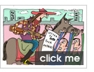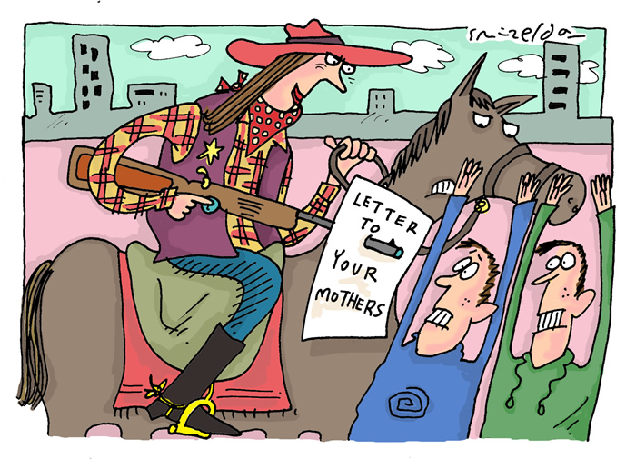 Just be cool, Shark, even if they wind you up with jokes about shooting birds. "Hello. I know you, but I haven't seen you with a gun before." "It's not ours. We borrowed it." "And we're only practising. On tin cans. Look." "OK, but I heard you say 'magpie', 'sparrow' and 'the one on the drainpipe'." "Yeah, but we were only joking." "How old are you?" "Er, 18. We wouldn't shoot birds. We might shoot you, though. Ha hahaha!" Annoyingly, the neighbourhood feels like my classroom when things like this happen. That's why I've just gone and made it personal, and therefore worse. I can't sit in my garden now. Not with just a lilac bush between me and a .22 rifle. They'll get bored eventually. Meanwhile, let's see what's on television. "Bang! Pyaooww... Bang!" Oh, for goodness' sake! I do quite like Westerns, though. "Yah see how id is? Whah, ain't nobody else in this town can make 'em change thar ways. Yah gatta stay!" "Whaddya want me to do write a ledder to thar momma?" That's it. Write to the parents! The googly-eyed one who said he'd shoot me I know where he lives. Now where's ma darn pen? OK, whose idea was it to call those things "air guns"? "Hey, Huckle, this thang don't do no harm. Why, jist shoots air!" "Doggone don't, you eedyut. Raght, that's done. I'll jis ride on over with it an' we'll see what happens at sunrise... Mighty quiet this mornin'. I don't like it... Reckon I might wait a while and see if they've quit shootin' for real... Well, whaddaya know? A liddle note fer me! "Thanks for writing. I didn't know my sons were playing with guns. Will make them stop. Sorry." Yep. Sheriff Shark did it the hard way. Took on the momma. Real quiet round here now, but good quiet, if ya know whadda mean. Not mouth-dry quiet like the summer of '06. Back then it wuz too darn hot to shoot. Kinda strange recallin' it now, with the rains an' all. Last summer, cowboys rode to hell to cool down. Nothin' strolled the sidewalks but tumbleweed an' dust. Rain became a memory, then a story people told but nobody believed no more. But this year why, we had Noah's Flurd all over agin. Yer might say Sheriff Shark swam right in with it. Haw haw! We could kinda use someone like that up at the ol' schoolhouse come September. Someone real mean. More from Emily in a fortnight