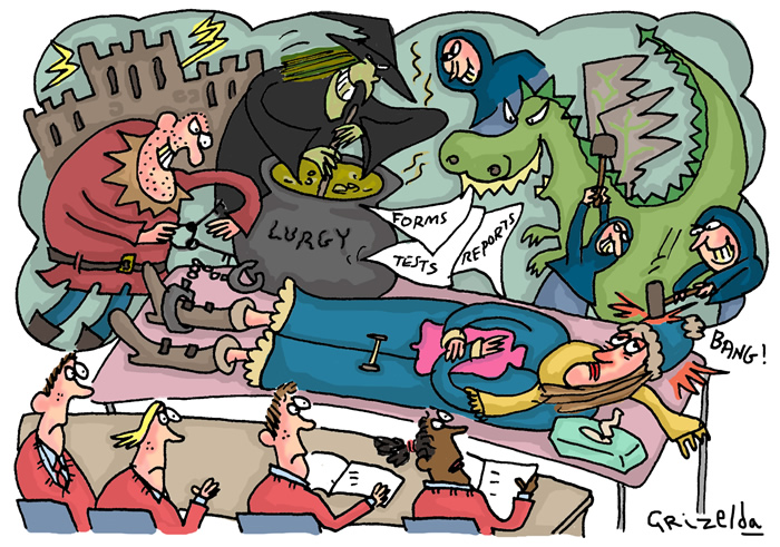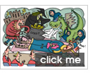 "Zap-A-Cold's army of special ingredients beats colds fast. No more Lord Sneezie for you - you'll be Sir Busie again in no time." Great. Sir Busie and his faithful steward, Erlimorn, drag you out of your cosy castle and shove you back to work. The silent and punctual Erlimorn inspects the army of Zap-A-Cold while Sir Busie barks orders. Then they march you off to school where you get another bloody cold because school is Castle Virus. The grey dragon, Worklode, lives in Castle Virus. Worklode eats time and spews paper. Tests and tables drip from its jaws. No one can kill it, though some have tried to seal a treaty with it. The creature merely scanned the Worklode Agreement with its pitiless white eyes. It breathed cold fire at the parchment, then slid beneath it to find new hiding places and eat some more time. The great dark is upon us, filled with the sound of coughing. Cold sores blight you: these are the curse of the red witch, Herpy Simplex. Bolt your castle fast - still you cannot shut out Vilecolde and his minion, Scratchthroat. They seep through the walls and seize you where you lie, exhausted by Worklode. Castle Vilecolde's grounds are vast. You may be tossed in the sneezing fountain of Streaming Cold or drowned in the swamps of Stinkynge Cold. Or you may lie in the dungeons, racked by three invisible jailers: Shivez, Aykes and Paynes. Vilecolde may leave you on Mount Hedake or dangle you in the Cracks of Megrayne. Pacing among these is Viscount Snottye in his pale and slippery cloak. Aristocratic half-brother of the Bogeyman, Snottye gathers rent from his vast domain of Menz Tishuz. He lives in a green tower by the Fens of Catar and the River Flem. He will hold you there for a week. The Palace of Farmasy recommends Sir Vitamyncy on his shining orange horse. The pale forgotten sisters, Aspa Rhynn and Honian Leman, also appear. The elegant French knight, Serote Pastille, soon tires of soothing your throat. Ere long you are coughing again. In these hard days, your best hope lies in the brilliantly trained mercenary soldiers of Aibu Profen. Trust not the Ledge of Snooz. Comfort only comes with Mistress Cozibedde and Lady Duvay. In the evening quiet, a rider patrols your castle grounds. This is the Erly Knight. He lifts the drawbridge so that Worklode cannot reach you. The beat of hooves fades into silence as you drift into sleep.